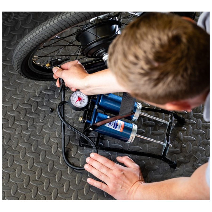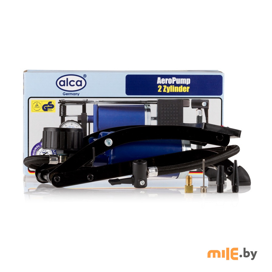 Пневматический шланг 60 см и 4 специальных адаптера (для автомобильных, велосипедных шин и мячей, и т. п.). Особенности: 2 цилиндра, 7 бар с точным манометром. Цилиндры и рама изготовлены из высококачественной стали. Пневматический шланг (45см) и 4 специальных насадки.