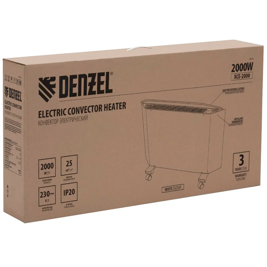 Электрический конвектор Denzel XCE-2000 98132 белого цвета, максимальной мощностью 2000 Вт, с сушилкой для одежды, колесами и X-образным нагревательным элементом, работает от сети 230 В и предназначен для обогрева закрытых помещений площадью до 25 м2. Надежный и долговечный X-образный нагревательный элемент обеспечивает быстрый нагрев до необходимой температуры.