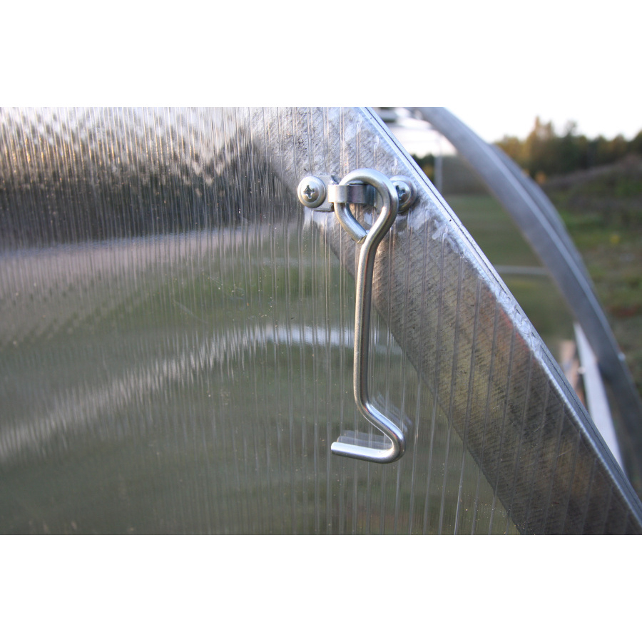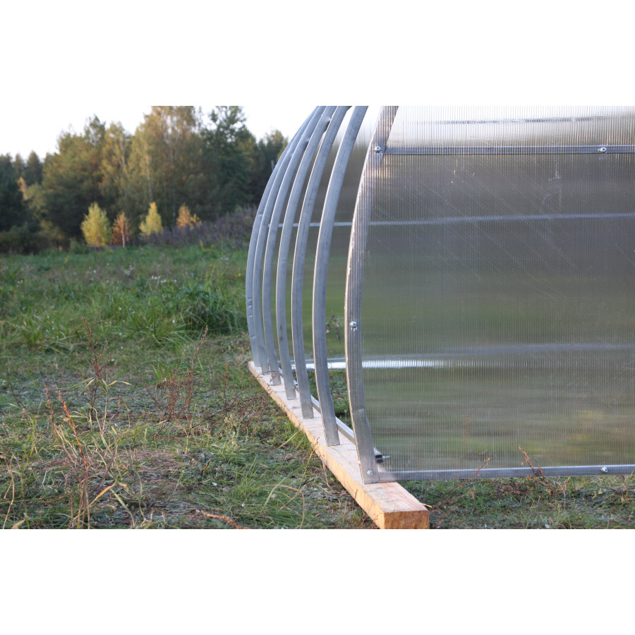 Высота теплицы 2 метра. Высота конструкции позволяет с удобством выполнять все работы, растения беспрепятственно растут вверх. Подходит для выращивания высокорослых и вьющихся сортов. Увеличенная ширина 3,3 метра. В теплицу Вы сможете посадить больше растений, установить высокие грядки и оставить достаточное место для прохода между рядами. Каркас изготовлен из прочных массивных труб сечением 40х20 мм. Эти параметры делают теплицу устойчивой к снеговым нагрузкам и сильным ветрам. Такая конструкция не требует дополнительного укрепления или демонтажа на зимнее время. Трубы оцинкованы. Оцинковка защищает металл от коррозии. Все сварные швы покрыты антикоррозийной краской. Комплектация теплицы: 1. Профильные трубы (каркас); 2. Профильные трубы (поперечины); 3. Грунтозацепы; 4. Болты; 5. Шайбы; 6. Гайки; 7. Саморезы; 8. Кровельные саморезы; 9. Поликарбонат сотовый с двойной УФ-защитой. В комплект к теплице так же входит паспорт изделия. В нем содержится подробное описание по сборке конструкции и раскройке поликарбоната. С помощью инструкции Вы сможете без труда монтировать (и демонтировать, при необходимости) теплицу.