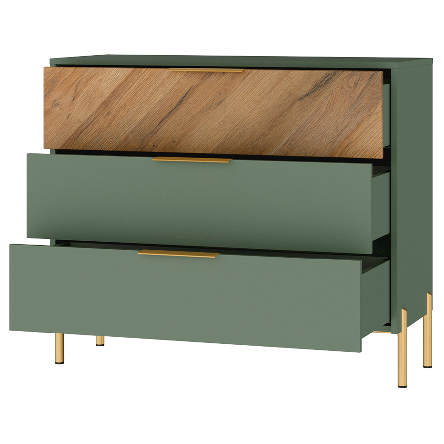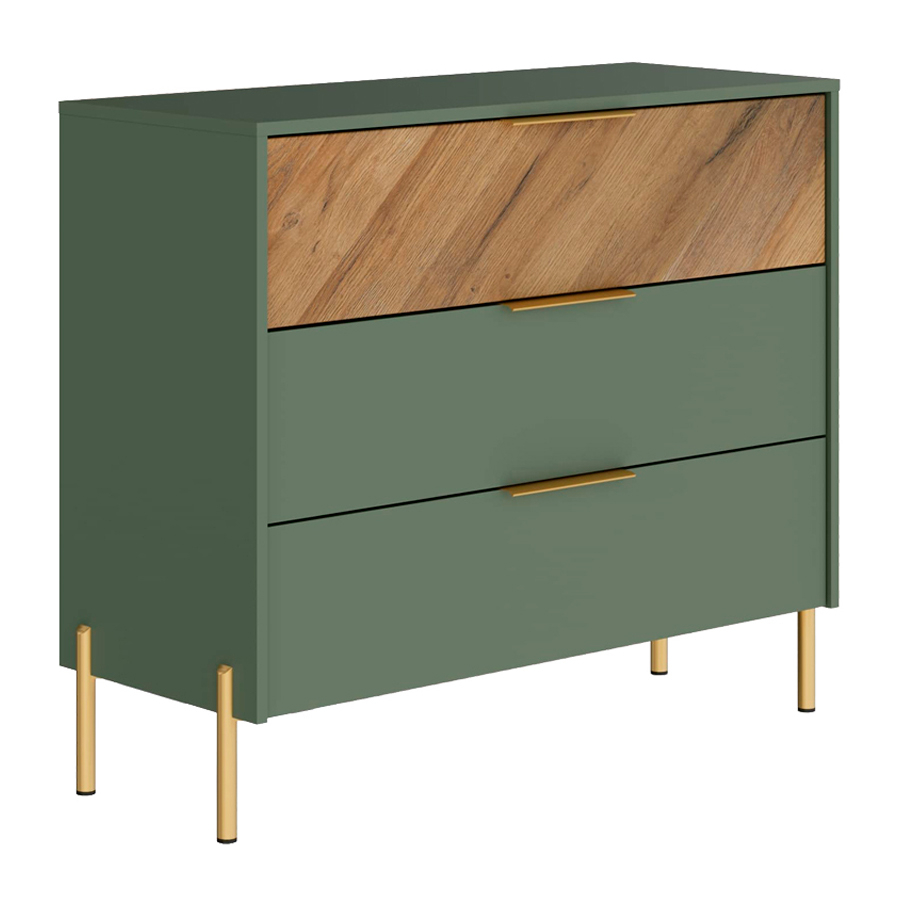 Фасад: ЛДСП и Плита МДФ односторонняя ламинированная, цвет натурального дерева с диагональной текстурой. Высокие тонкие металлические ножки матового золотистого цвета. Элегантные ручки матового золотистого цвета. Ящики на направляющих скрытого монтажа частичного выдвижения.