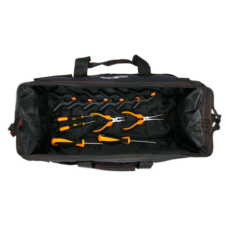 Объёмная сумка для инструментов XXL — это идеальное решение для тех, кто ценит порядок и удобство при хранении и переноске бытовых инструментов. Благодаря внушительным размерам 46x22x24 см, в ней легко разместятся как крупные, так и мелкие предметы, необходимые для ремонта или домашних работ. Вместительный основной отсек позволяет держать под рукой всё самое важное, а девять дополнительных карманов обеспечивают отличную организацию и быстрый доступ к часто используемым инструментам. Особое внимание заслуживает материал сумки — прочный полиэстер, который отличается высокой износостойкостью и устойчивостью к загрязнениям. Такой материал не только надежно защищает содержимое от влаги и пыли, но и сохраняет презентабельный внешний вид даже при интенсивной эксплуатации. Надежная молния обеспечивает легкое открытие и закрытие сумки, предотвращая случайное выпадение инструментов и гарантируя их сохранность во время транспортировки. Эта сумка станет незаменимым помощником для каждого домашнего мастера. Она сочетает в себе вместительность, прочность и продуманную эргономику, позволяя всегда держать инструменты в порядке и под рукой. Благодаря стильному и практичному дизайну, сумка органично впишется в любой интерьер мастерской или гаража, а также станет отличным подарком для тех, кто любит заниматься ремонтом и создавать уют в доме своими руками.